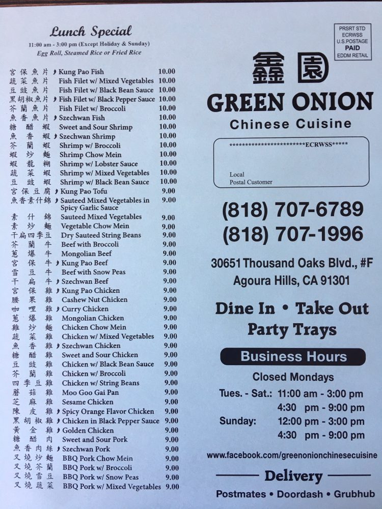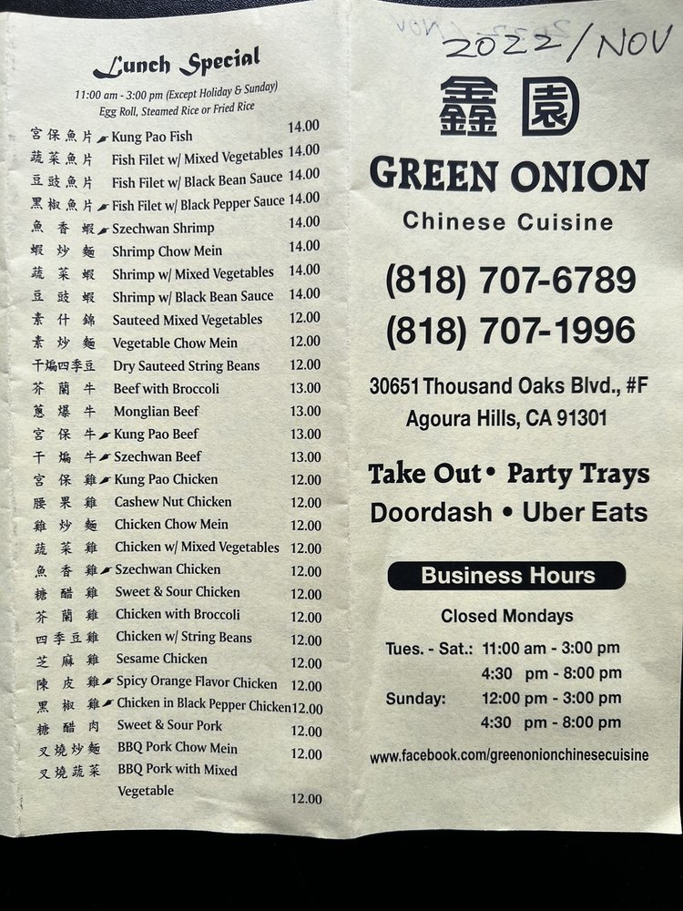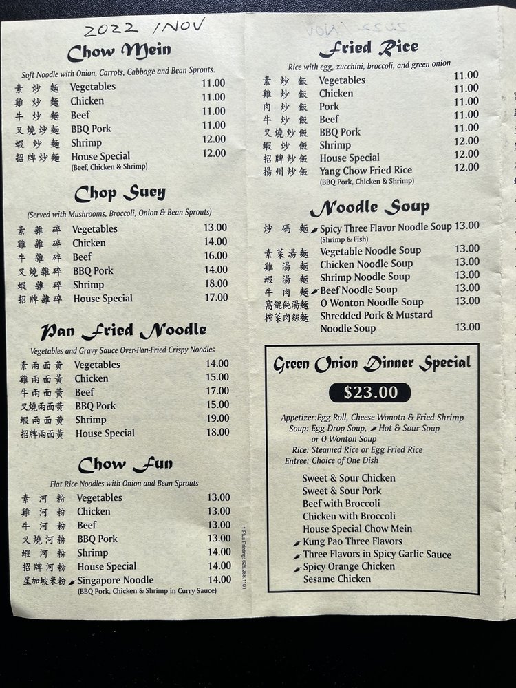 Green Onion Chinese Food is a casual Chinese restaurant located in Agoura Hills, CA. Specializing in traditional Chinese dishes, they offer a wide variety of options for vegetarians and meat lovers alike. With options like Pan-Fried Noodles, Chow Fun, and Fried Rice, there is something for everyone to enjoy. Customers rave about the fresh and flavorful dishes, with standout favorites like the Honey Walnut Shrimp and Chicken Fried Rice. The restaurant offers takeout and delivery services only, with no indoor dining available. Despite the limited seating options, customers appreciate the quick service and friendly staff. Green Onion Chinese Food is a go-to spot for authentic Chinese cuisine with generous portions and fantastic taste. Highly recommended for a delicious Chinese food experience.